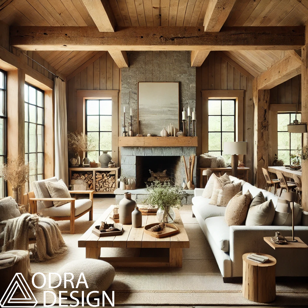 Kolorystyka: ziemiste beże, ciepłe brązy, naturalne drewno.